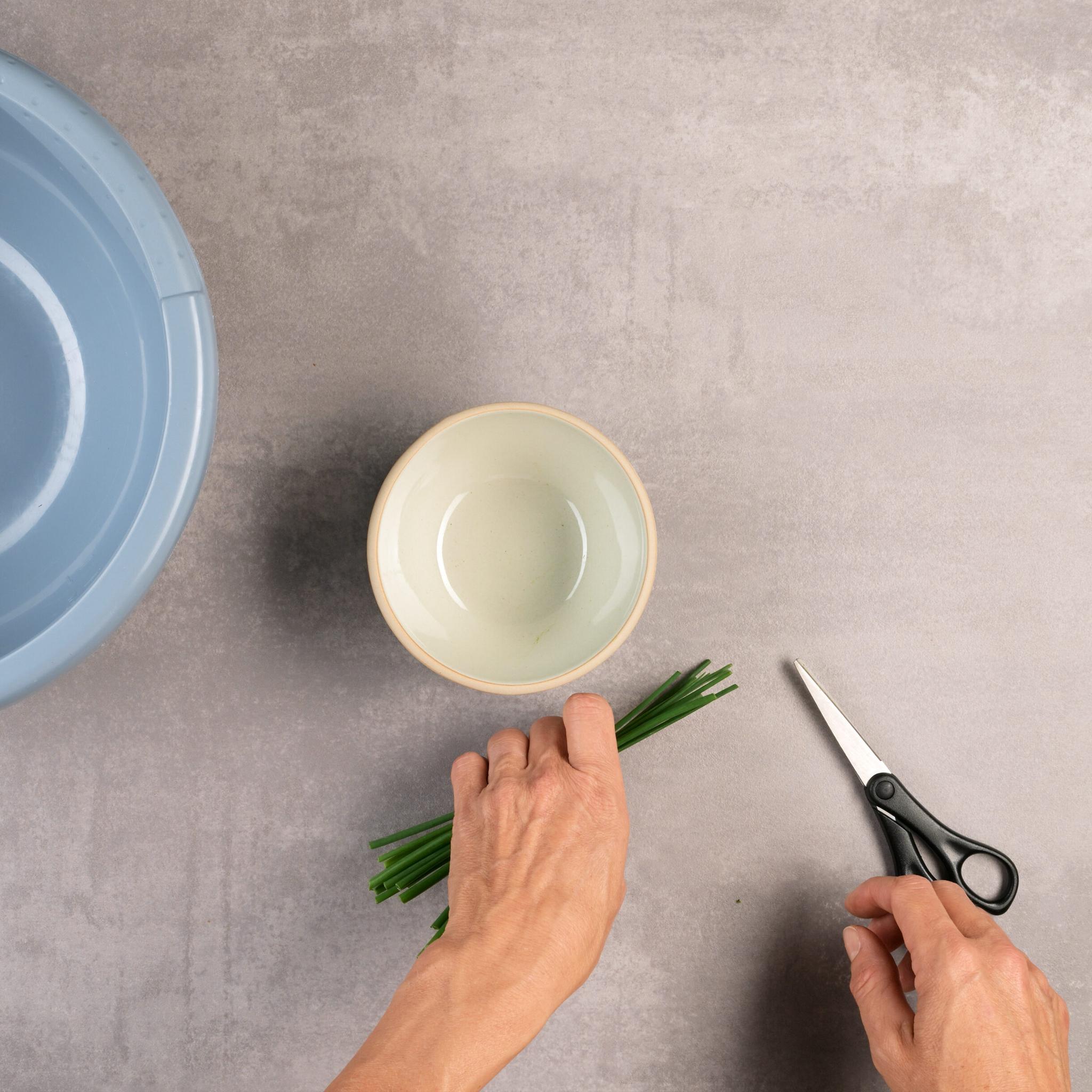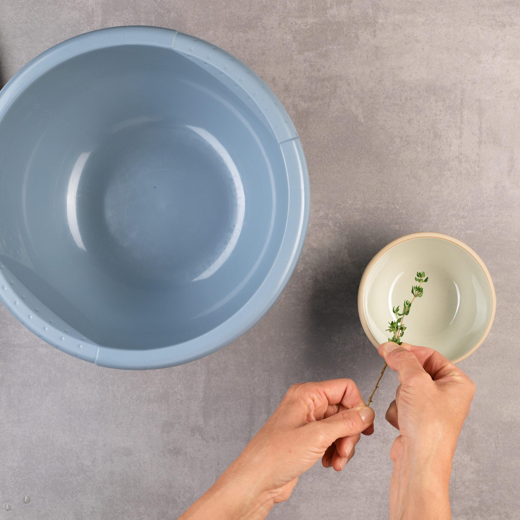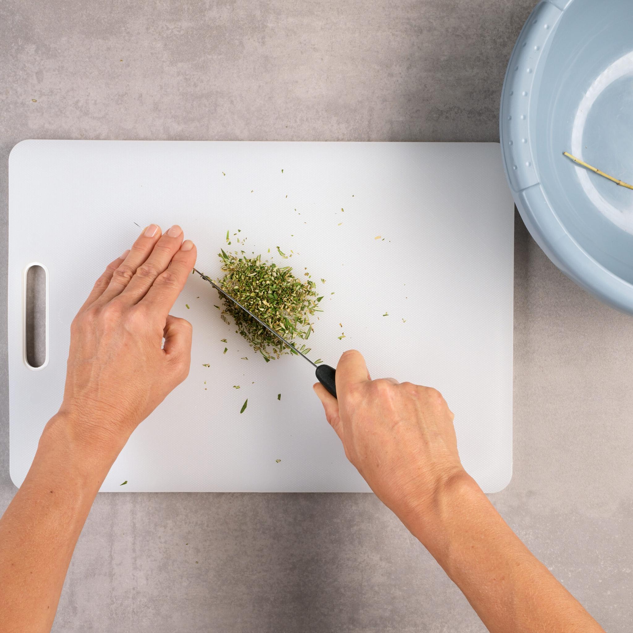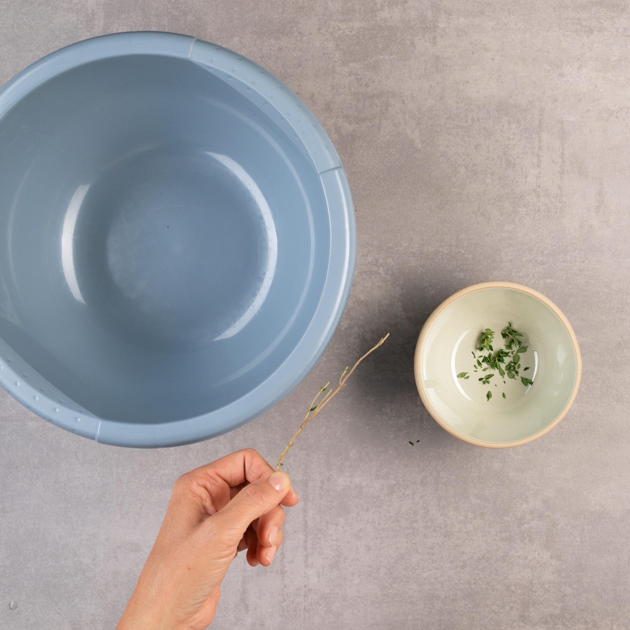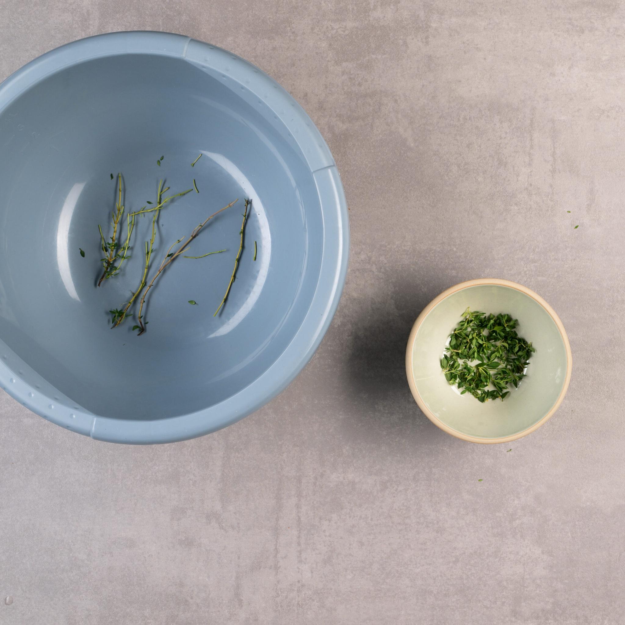 Tu peux récolter des herbes fraîches soit dans le pot sur le rebord de la fenêtre, soit en acheter en bouquet au magasin. Plus les herbes sont fraîches, mieux c’est. Si tu dois tout de même les garder, place le bouquet dans un verre d’eau comme des fleurs coupées. Tu peux également couper les herbes fraîches, les congeler dans un bac à glaçons et les conserver ainsi.