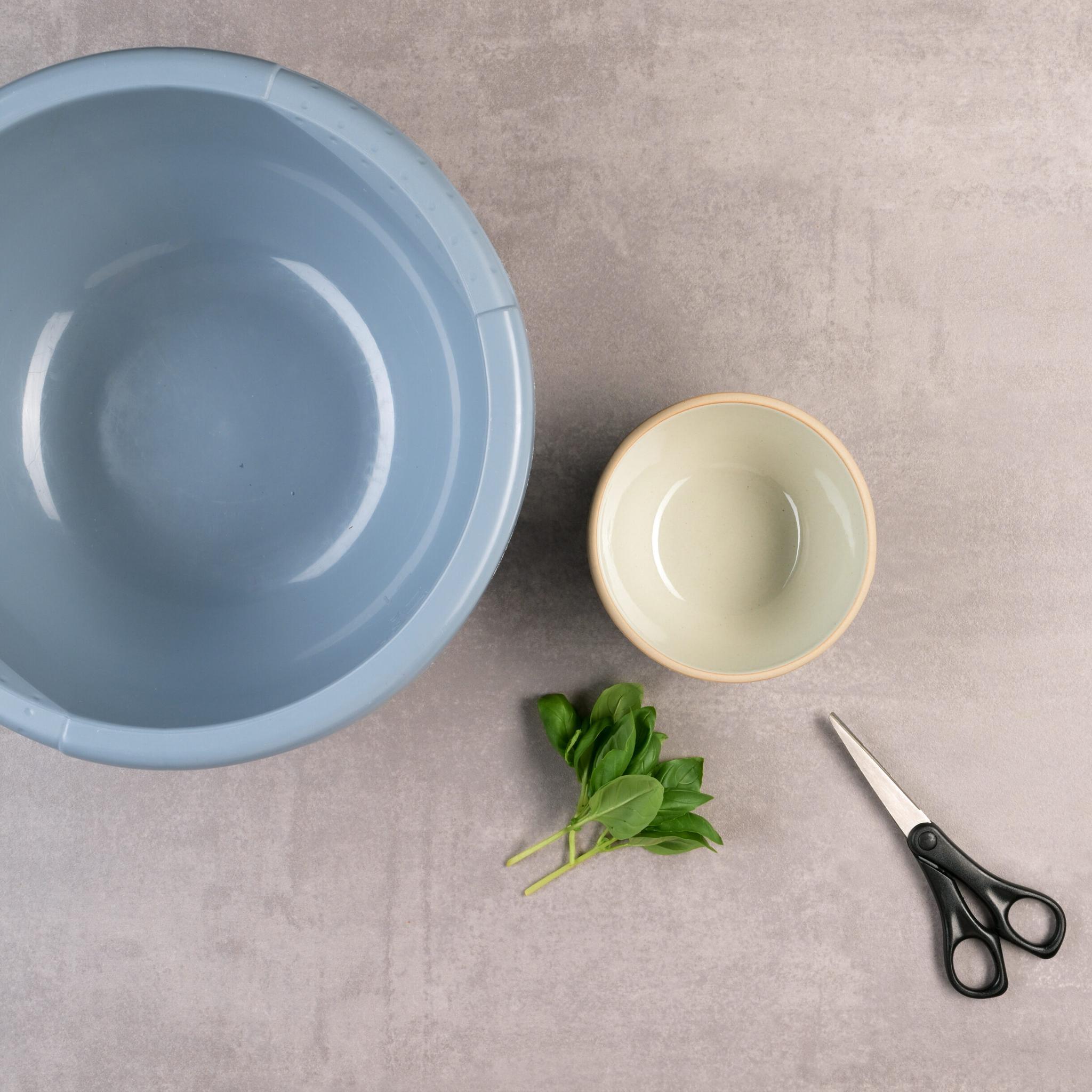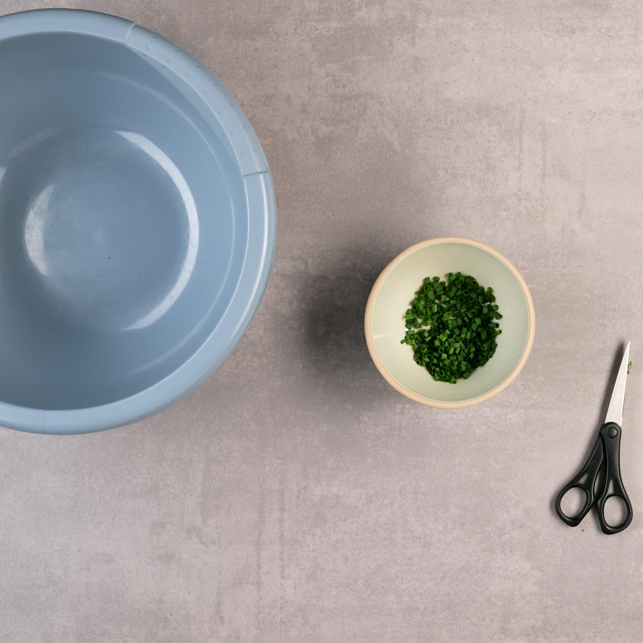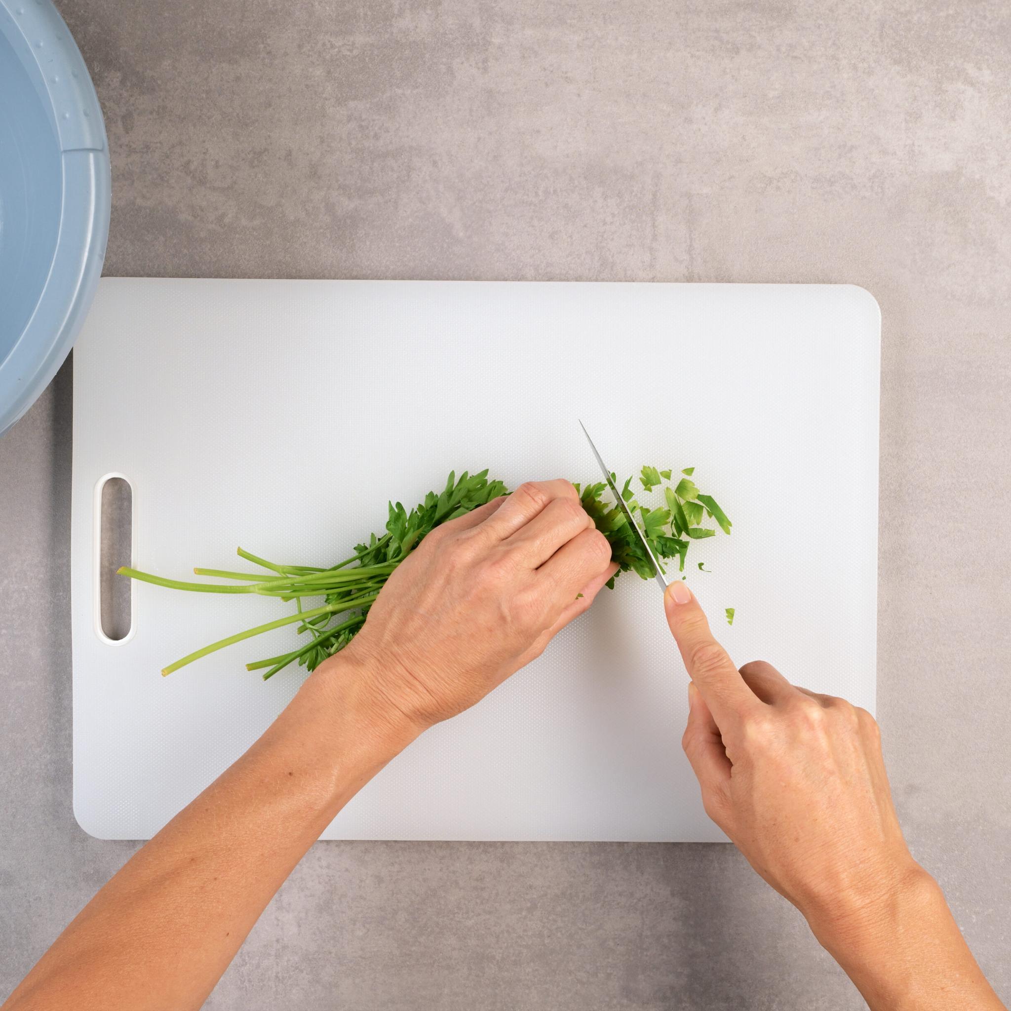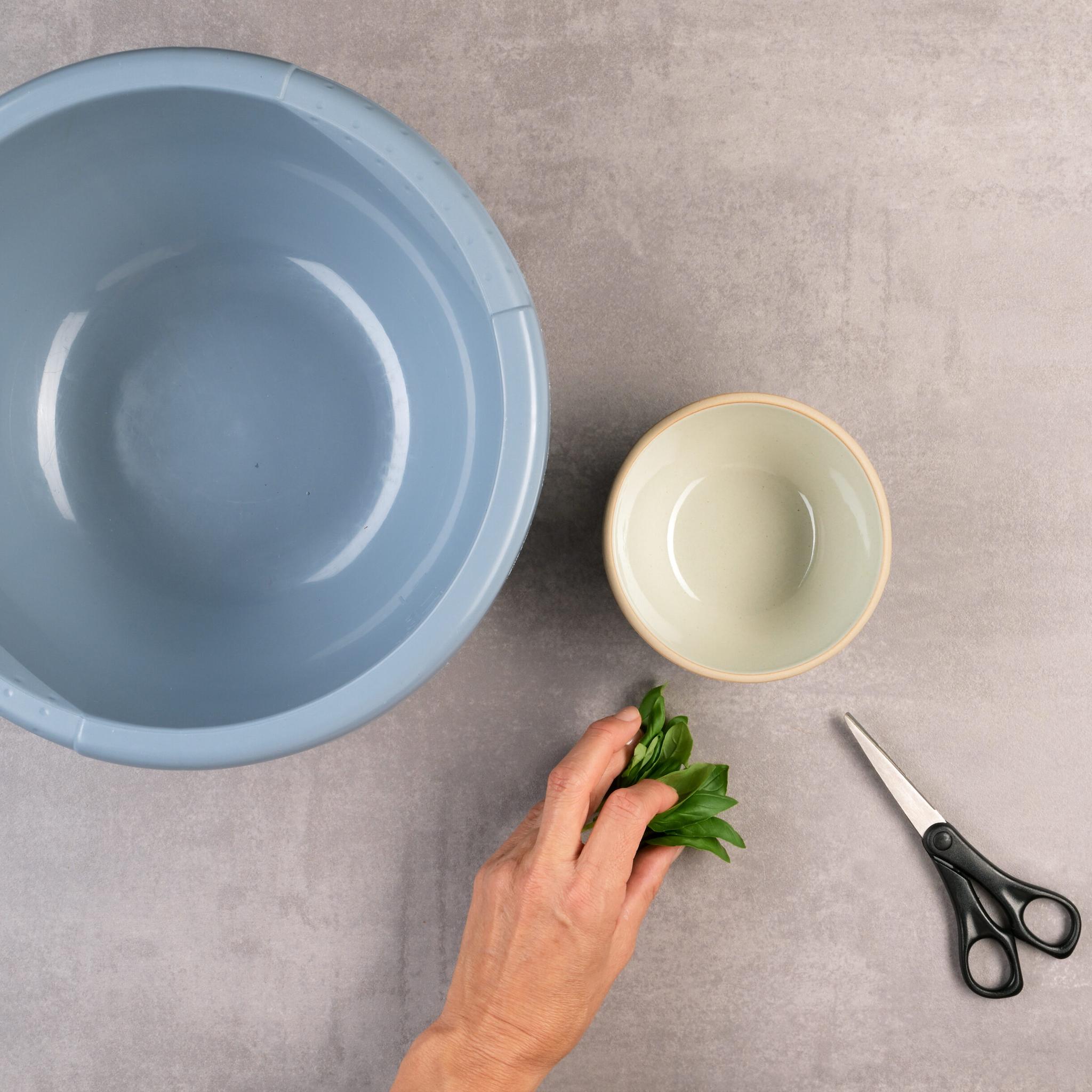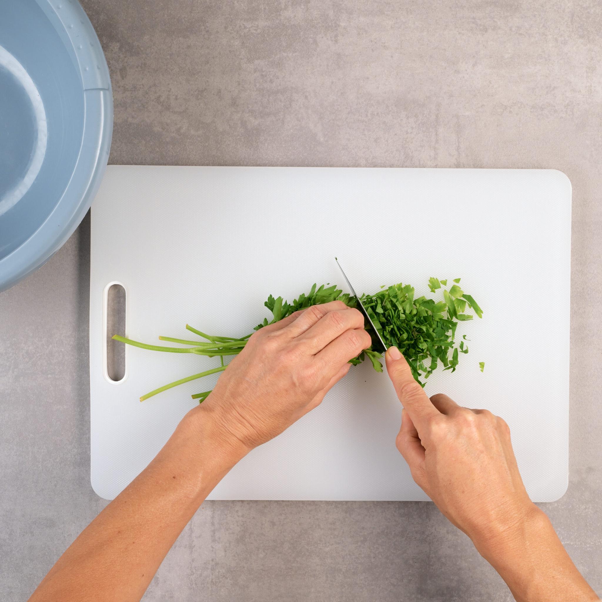 Tu peux récolter des herbes fraîches soit dans le pot sur le rebord de la fenêtre, soit en acheter en bouquet au magasin. Plus les herbes sont fraîches, mieux c’est. Si tu dois tout de même les garder, place le bouquet dans un verre d’eau comme des fleurs coupées. Tu peux également couper les herbes fraîches, les congeler dans un bac à glaçons et les conserver ainsi.