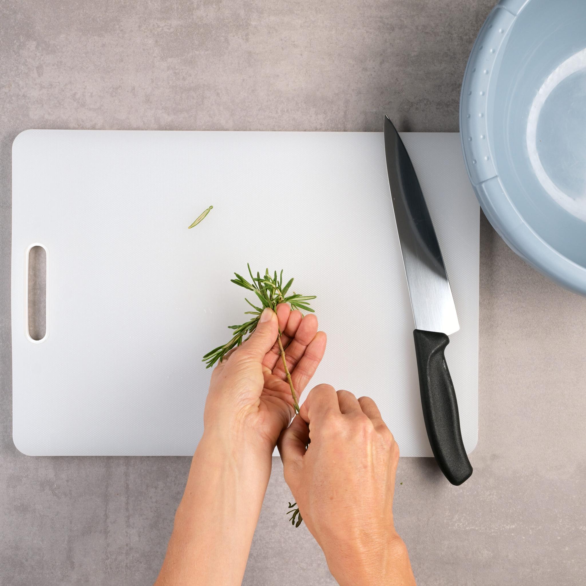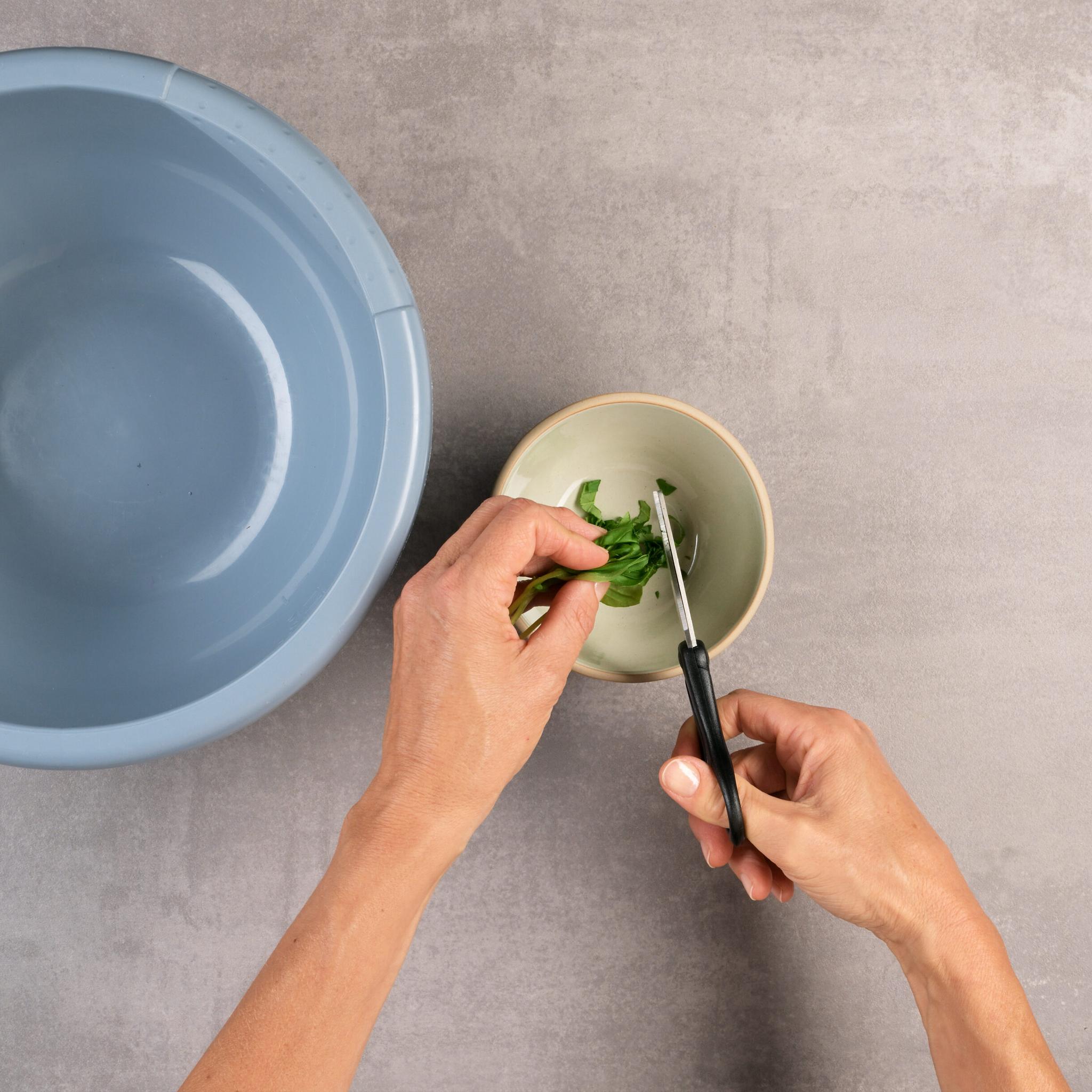 Les herbes qui ont été en contact avec la terre doivent être lavées. Ne coupe les feuilles et les tiges qu’au moment de les utiliser, à l’aide d’un couteau bien aiguisé ou de ciseaux de cuisine propres. Cela permet de préserver les arômes des herbes.