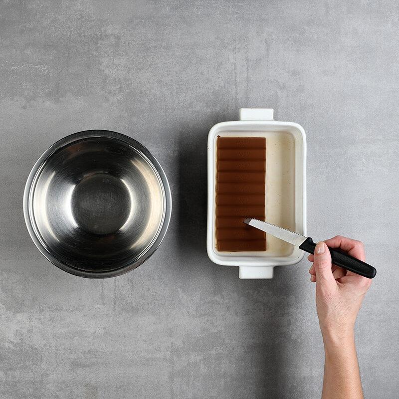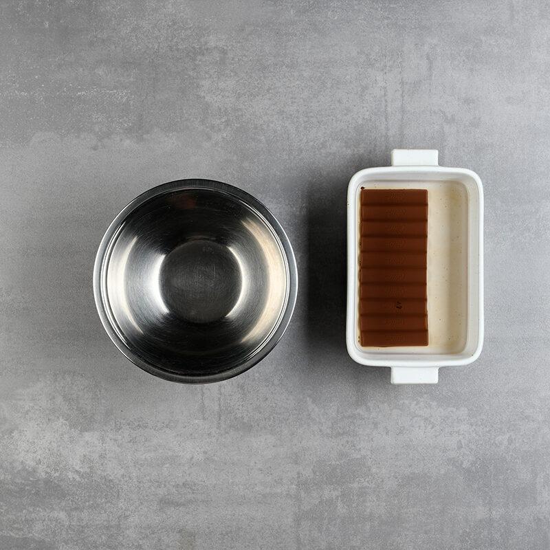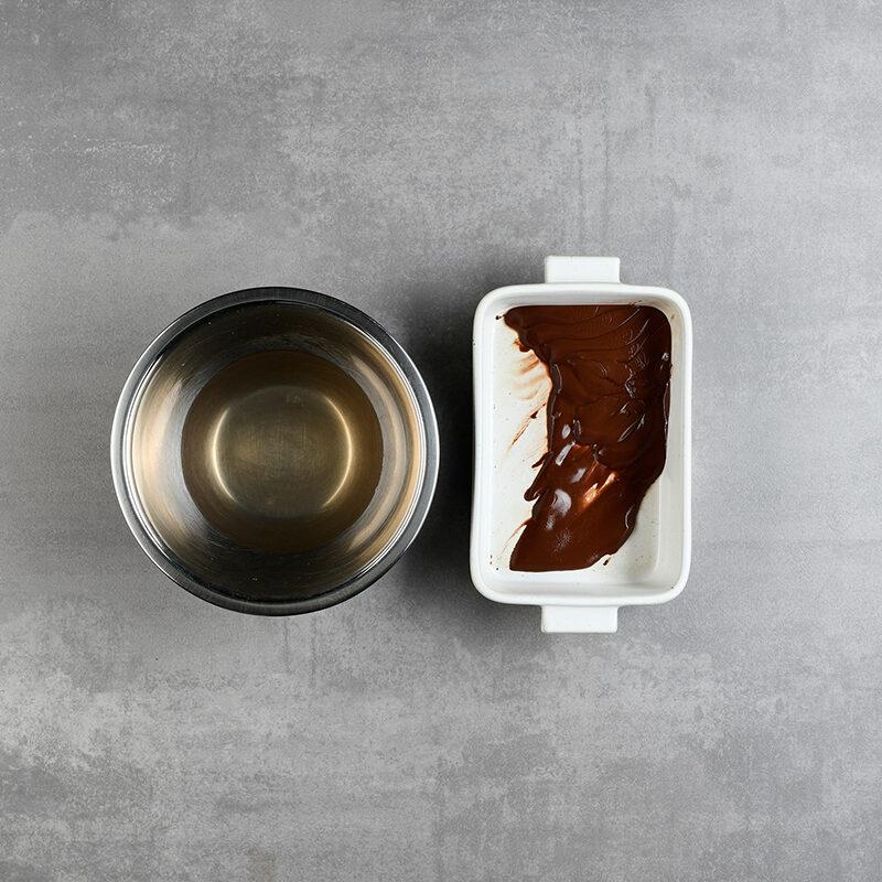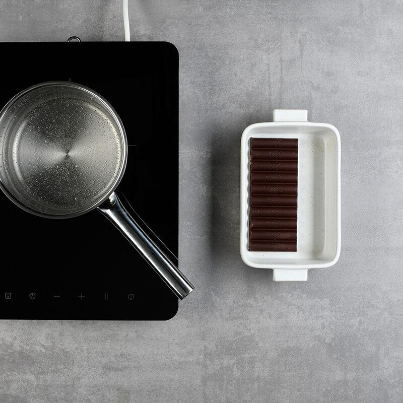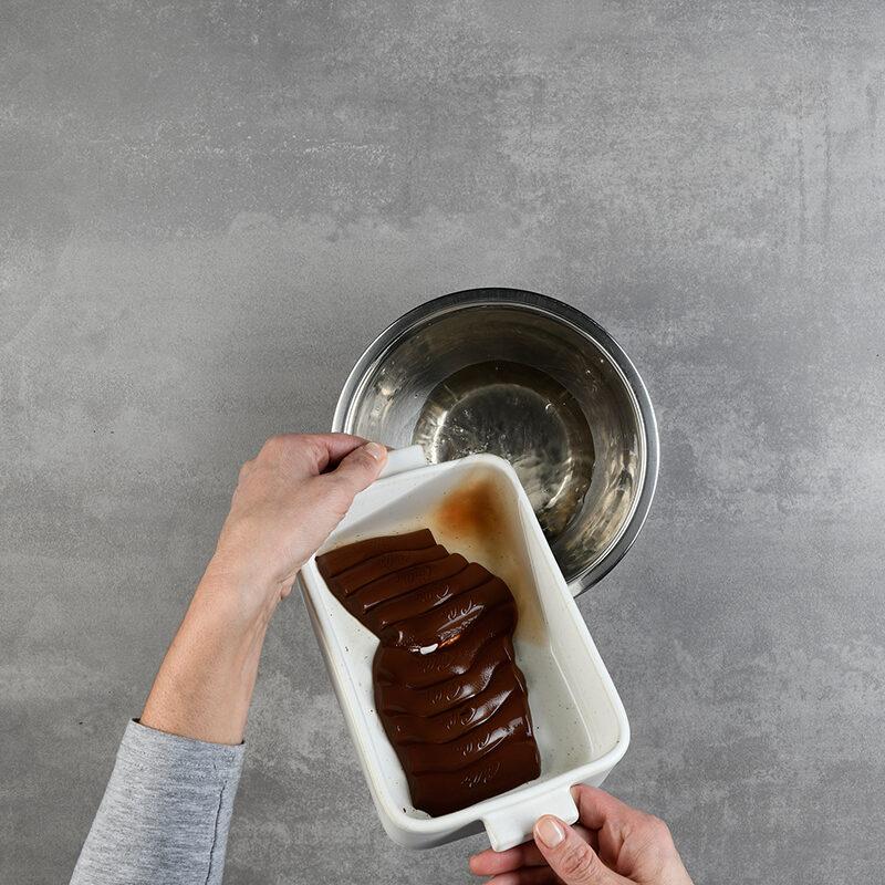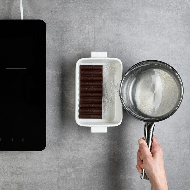 Pour la seconde, il faut également de l’eau frémissante. Le chocolat ne fond toutefois pas avec la vapeur d’eau, mais est recouvert d’eau chaude. Tu trouveras les instructions ici: