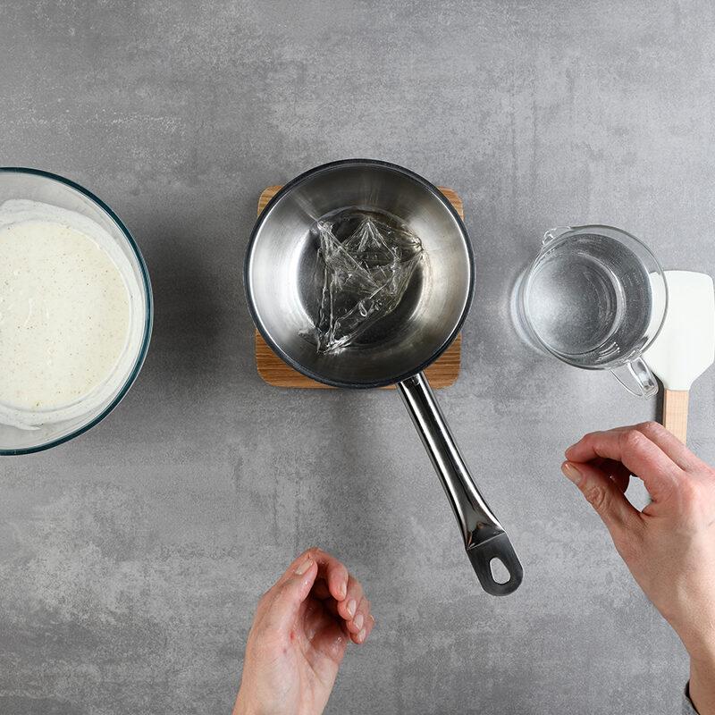 La gélatine est utilisée dans les desserts pour lesquels une masse doit prendre au réfrigérateur. Dans le commerce, la gélatine est disponible sous forme de poudre ou en feuilles.