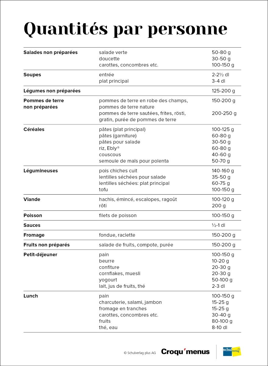 C’est pourquoi les «quantités par personne» sont indiquées sous forme de plages «de – à». Ces données doivent être considérées comme des valeurs indicatives.